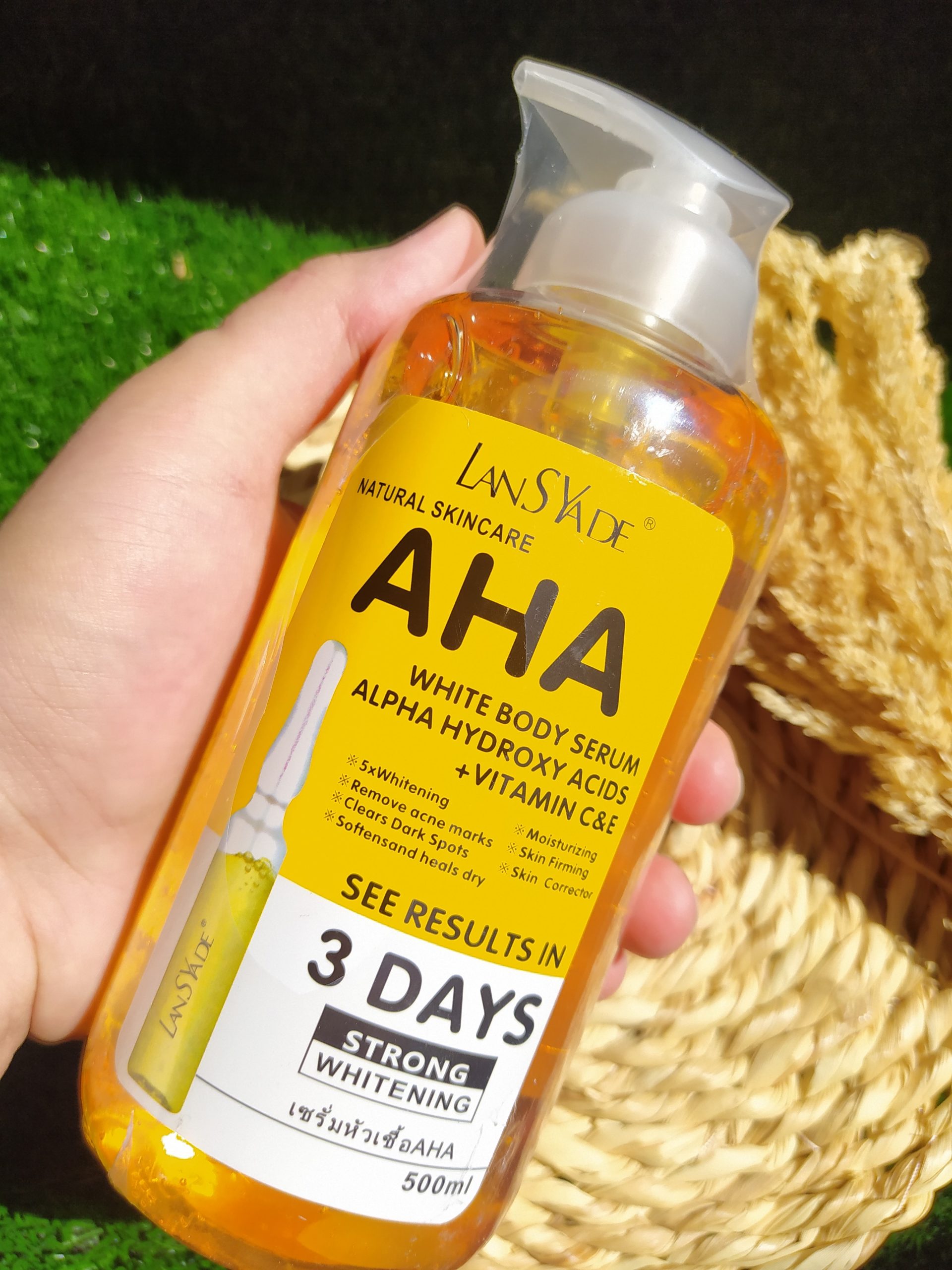 - سرم روشن کننده بدن aha به تدریج آثار باقیمانده از آکنه و لکهها را محو کرده و پوست را صافتر نشان میدهد.